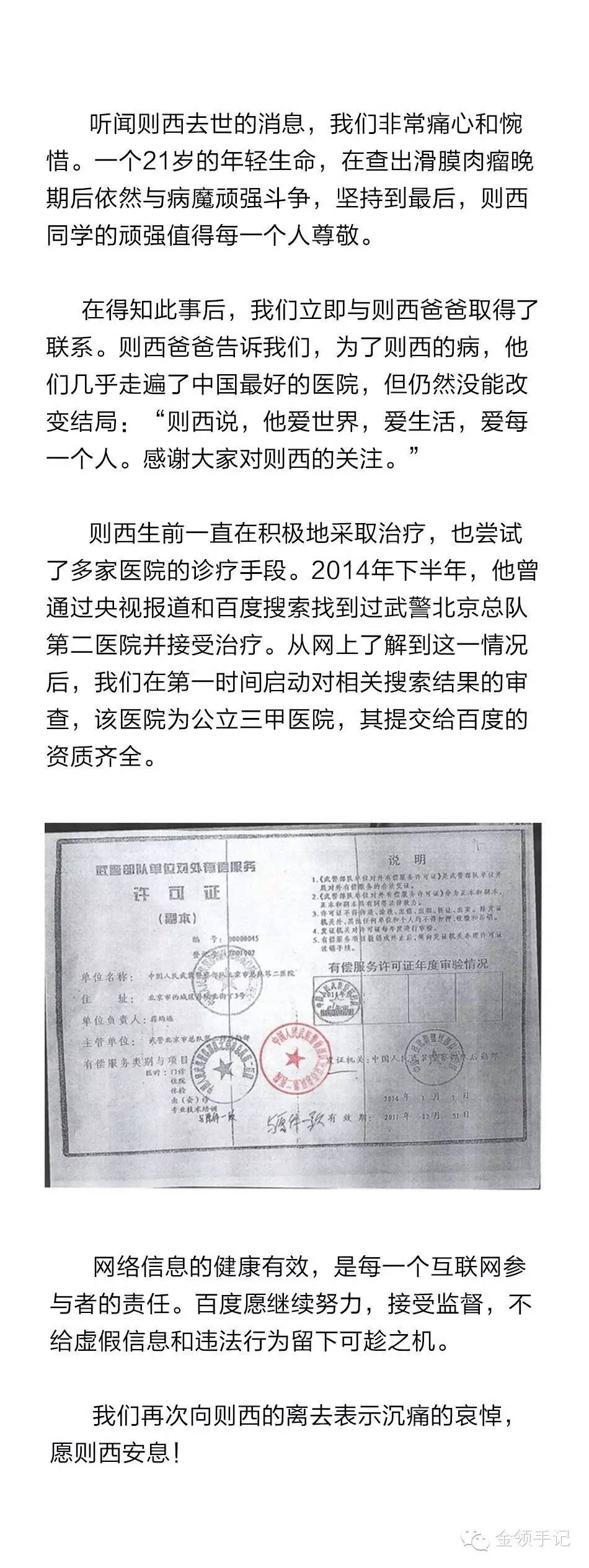 “我們在第一時間啟動對相應搜索結果的審查,該醫院為公立三甲醫院,其提交給百度的資質齊全。”