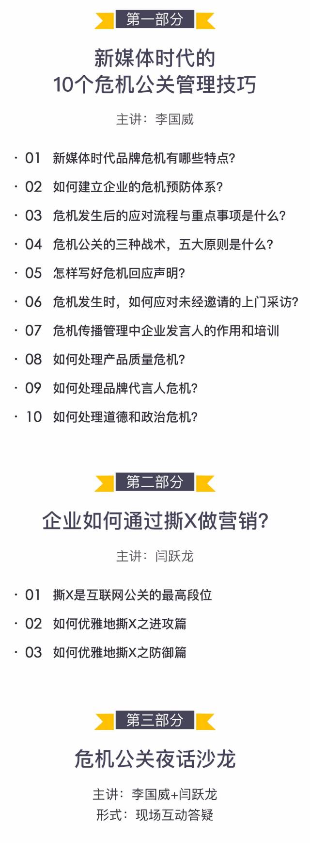 這些問題,我和閆躍龍老師會在一天的課和晚上的“公關夜話”中跟大家充分交流。