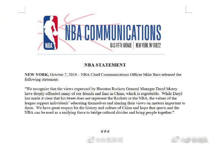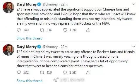 “我無(wú)意在推特上冒犯火箭隊(duì)球迷和我的中國(guó)朋友們,我只是基于對(duì)一個(gè)復(fù)雜事件的一種理解,表達(dá)了一種看法。自從那條推文發(fā)出以后,我有了很多機(jī)會(huì)去傾聽并考慮其他的觀點(diǎn)。我一直欣賞中國(guó)球迷和贊助商的大力支持,我希望那些感到不快的人了解到,冒犯或誤解他們并不是我的本意。我的推文僅代表個(gè)人觀點(diǎn),與火箭隊(duì)和NBA無(wú)關(guān)。”