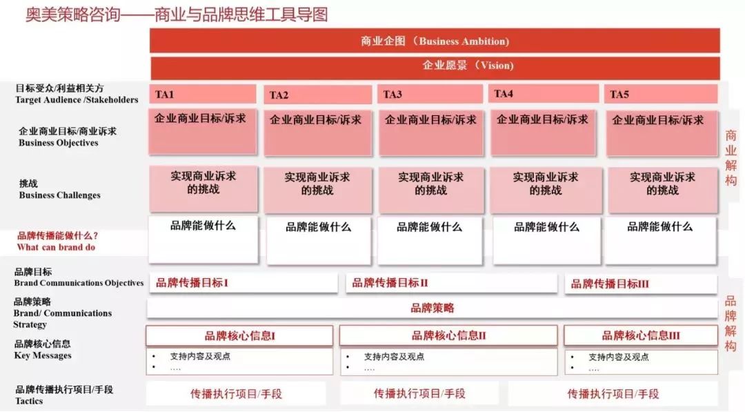 周晨:好處是對團隊的入門者,他們就是照模型填空就好;缺點是模型如果不能活用,反而限制手腳。比如奧美有個Business Ambition商業野心五角星,有時候不用填五個,三個,做成三角形也可以。
