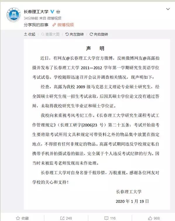 長春理工大學聲明說微博網友高露為本校2009級研究生,其在網上炫耀的考試攜帶手機并拍攝試卷的做法,“因當時為被監考老師發現而未作處理”。