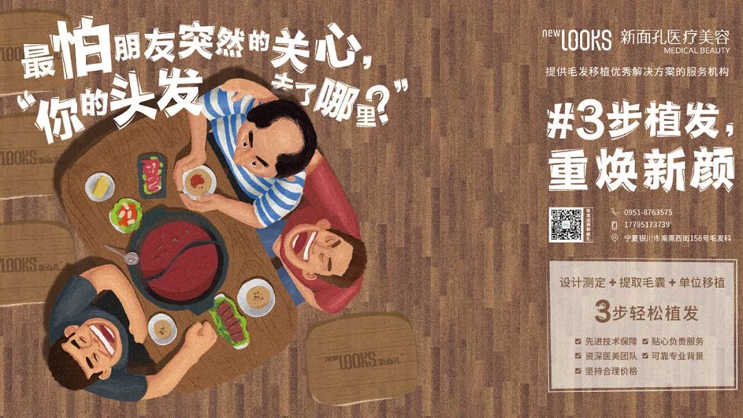 一組充滿喜感的廣告在城市小區電梯、公交站牌和線上投放??蛻舴答佌f,原來80%的植發用戶都是頭發有明顯問題的傳統用戶,即使年輕人也是大人帶著來的,廣告投放以后,現在傳統用戶和新的年輕用戶各占一半。
