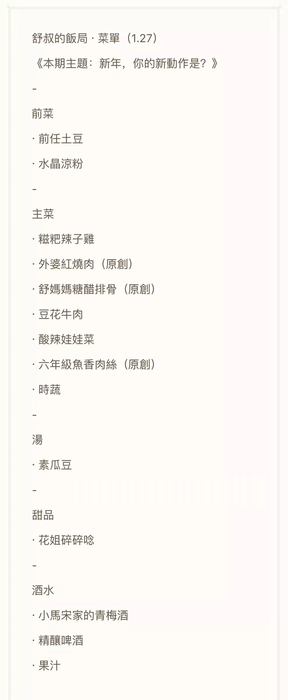 舒叔:這事得益于我有一個感性的母親,她喜歡研究美食,還不忘拉我幫忙假裝學習。所以我擅長的菜不少,但很多菜需要的物料比較復雜,例如我做的紅燒肉,必須需要30%濃度的葡萄糖。很多食材在上海找不到…… 所以“飯局”上的菜每期并不是都一樣,但在條件允許的情況下會做很多不同的菜。