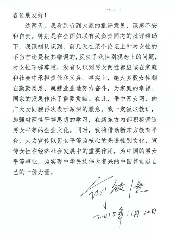 俞校長這次發表了關于婦女地位的不當言論,他本人在微博上道了歉,今天又去全國婦聯道歉,好多人說,新東方的公關好可憐。