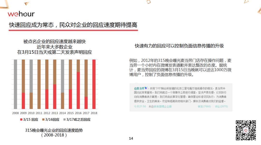 報告里你會關注一些事實,比如,2008年,所有在央視315晚會被點名的企業都是3月17日以后才回應的,而到了2018年,所有被點名的企業都在315當天向公眾作出了回應。