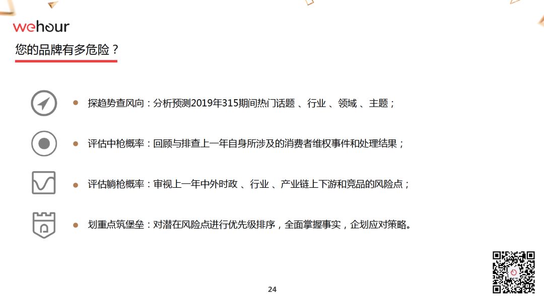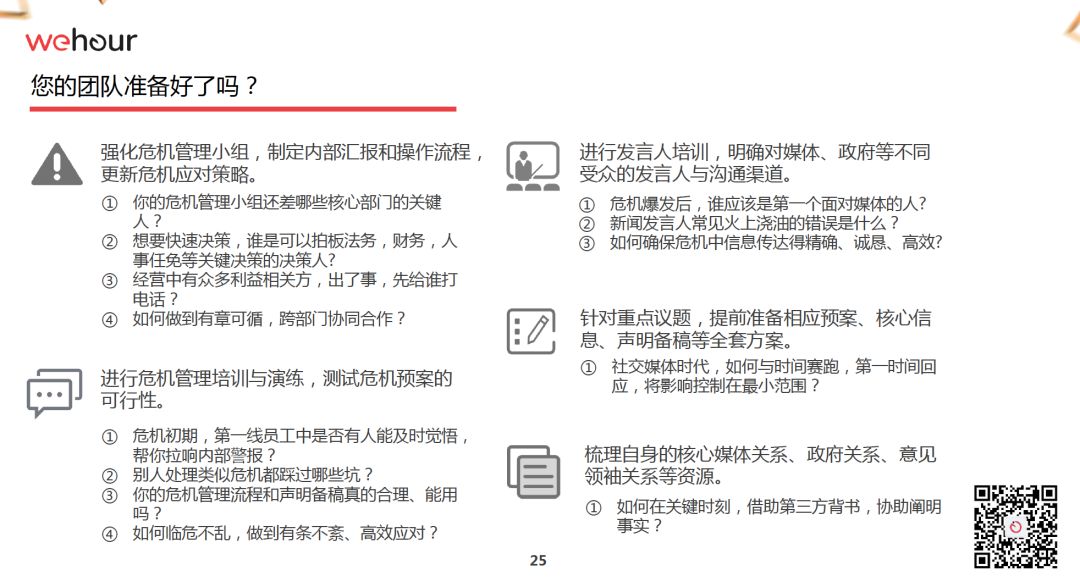 《315備戰紅皮書》下篇會收取一些費用,另外,我本人——姐夫李,還有Wehour創始人,前安可顧問中國總經理杜凌,資深公關人,優客工廠外部合伙人,前優步、亞馬遜、戴爾等公司高管高超,也會提供針對企業的危機公關內訓、模擬演練等較高收費的服務,詳情請點擊下面Wehour公司二維碼。