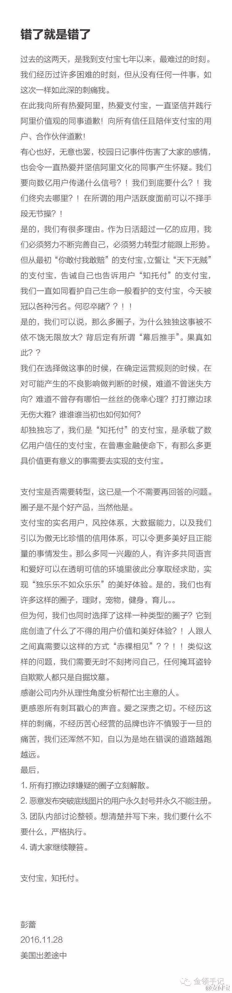 附:支付寶彭蕾道歉信