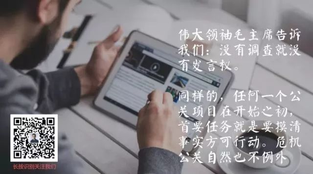 在擺事實階段,要厘清危機事實,但凡與危機有關的部門都應該第一時間做出積極溝通、配合。事實調查中,要多路分工,全方位羅列事實,100%還原事情真相。而在做回應方案和聲明時,還要同時考慮好事情可能發展的多種走向及多種應對策略。
