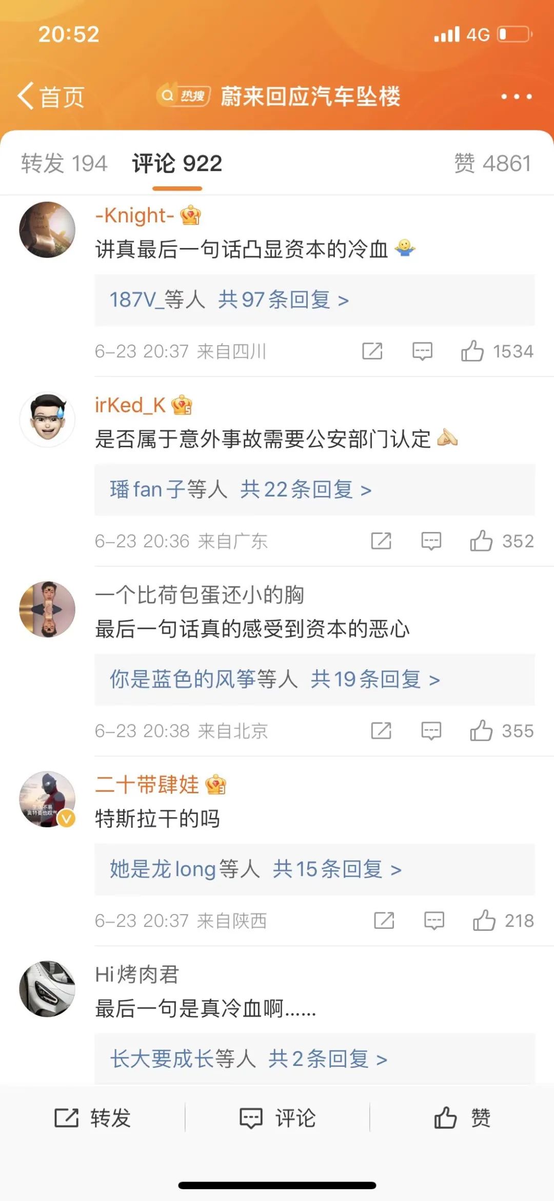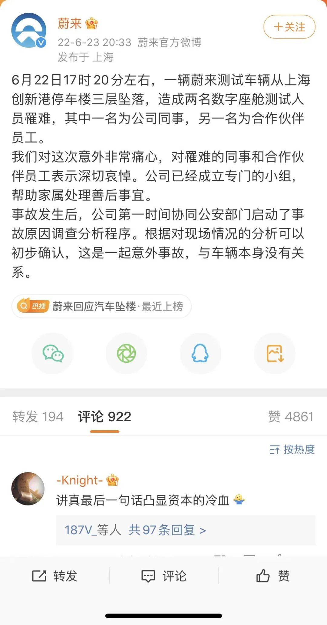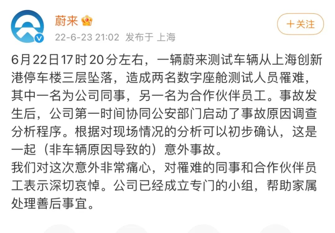 蔚來第一次聲明強調“與車輛本身沒有關系”,刪后再發,稱“非車輛原因導致”,被網友指“冷血”。