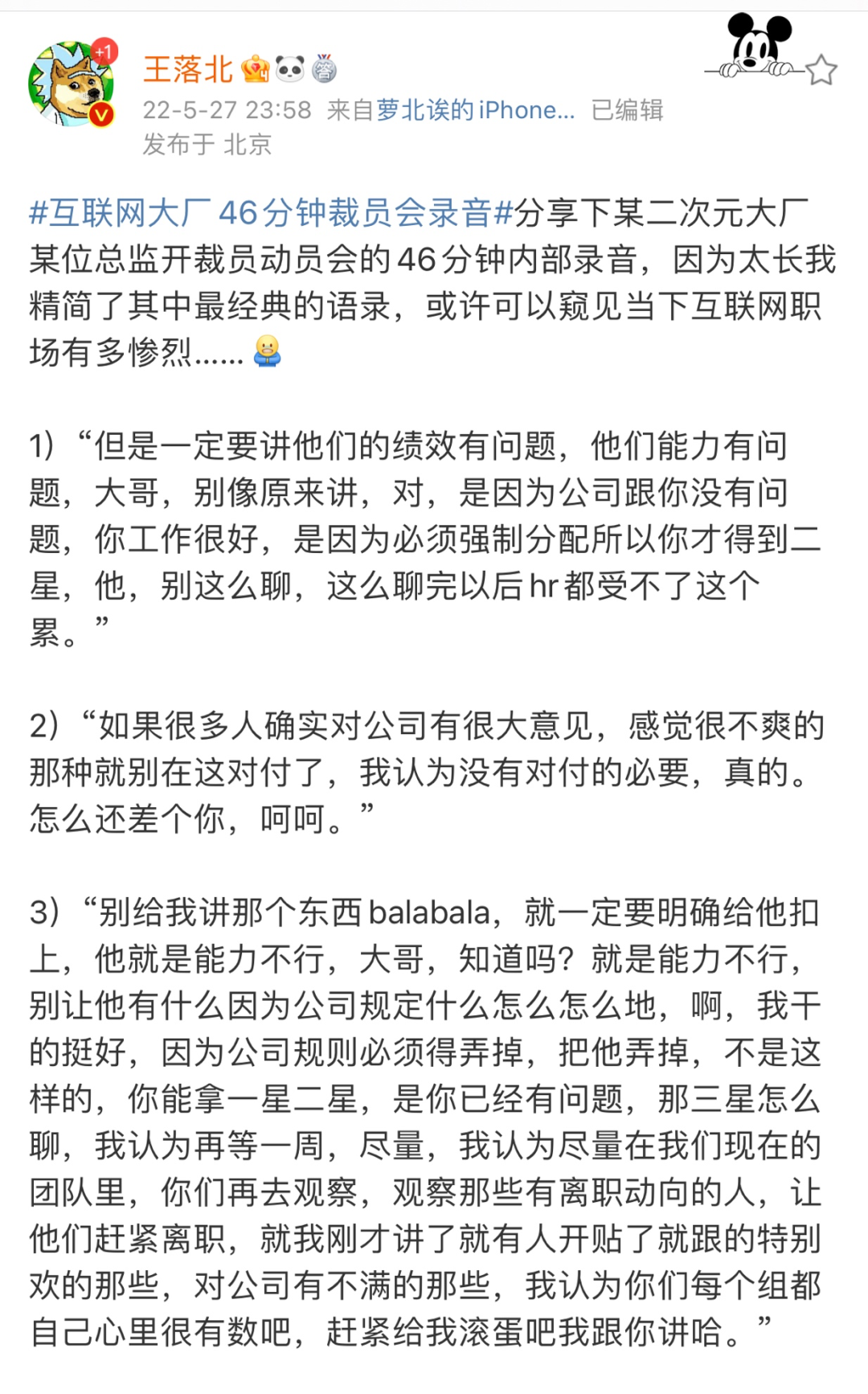 近日微博知名博主“王落北”爆料“某二次元大廠”總監開裁員動員會的46分鐘錄音,錄音中提到的諸如“制定一個他完不成的PIP(績效改進計劃)目標,考核不過就直接離職”等言論令人震驚。