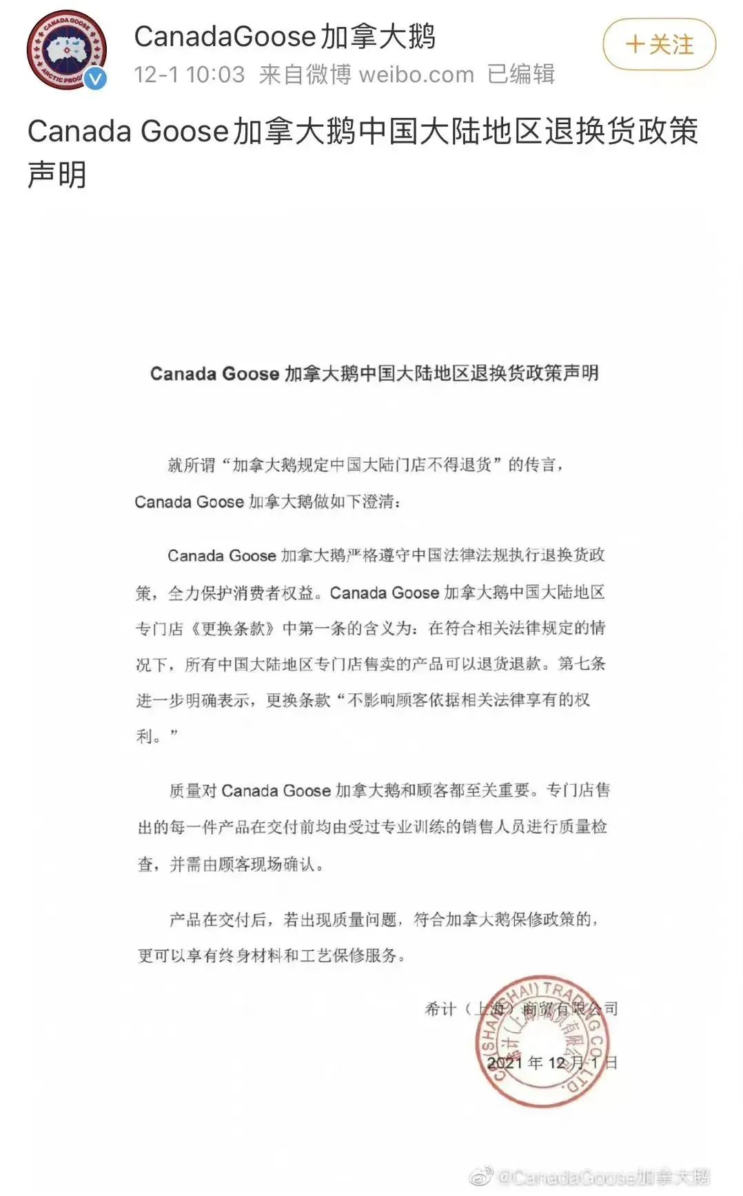 12月1日,加拿大鵝上海國金店同意為投訴的消費者退貨。