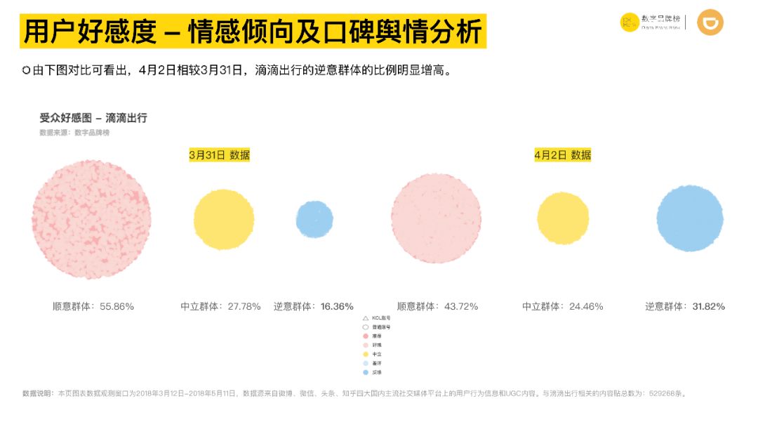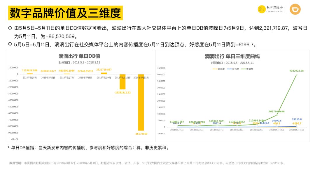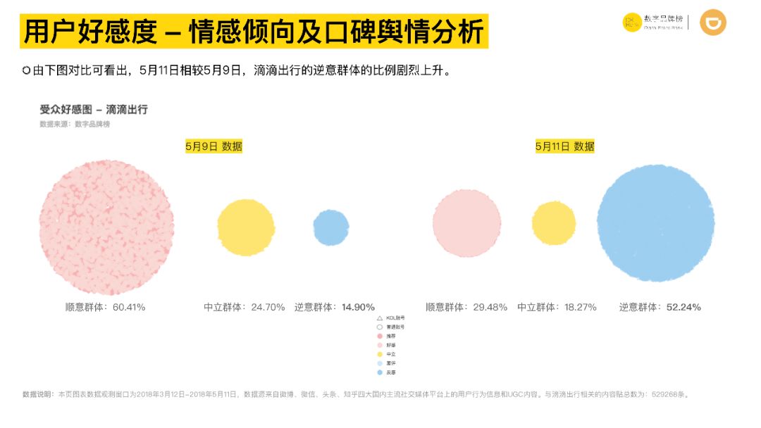 下面這張圖,表現了滴滴在微博、微信、頭條、知乎四大平臺上,內容傳播度在5月11日達到頂點,好感度也同時降到最低點。
